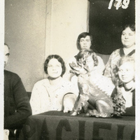 A photograph of the Pacific University Boxer mascot sitting on the Senior Blanket. This could possibly be during the Senior Breakfast in October, 1928. The original Boxer mascot was a gift to the school from a missionary named Reverend J. E. Walker. He acquired the Boxer while on a mission trip to China. The Boxer went missing after a Boxer Toss in 1969. This photograph appears in an album that was compiled by Edith Hansen McGill, a 1930 Pacific University graduate.