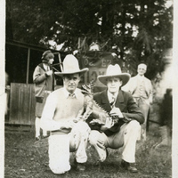 A photograph of two male Pacific University students holding the Boxer mascot. They are wearing large hats. A person in the background is holding the Senior Blanket. This could possibly be at the Senior Breakfast in October, 1928. Held at the faculty cabin. The original Boxer mascot was a gift to the school from a missionary named Reverend J. E. Walker. He acquired the Boxer while on a mission trip to China. The Boxer went missing after a Boxer Toss in 1969. This photograph appears in an album that was compiled by Edith Hansen McGill, a 1930 Pacific University graduate.