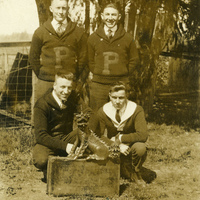 A photograph of four Pacific University students posed around the Boxer mascot. The caption with the photograph indicates that the Boxer had been captured by these students. The original Boxer mascot was a gift to the school from a missionary named Reverend J. E. Walker. He acquired the Boxer while on a mission trip to China. The Boxer went missing after a Boxer Toss in 1969. This picture appears in an album that was compiled by Greta McIntyre Sheeley, a 1920 Pacific University graduate.