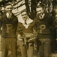 A photograph of three Pacific University students holding the Boxer mascot. The caption with the photograph identifies the students as Harry Kunkel, Henry Fiske and John Garrigus. The original Boxer mascot was a gift to the school from a missionary named Reverend J. E. Walker. He acquired the Boxer while on a mission trip to China. The Boxer went missing after a Boxer Toss in 1969. This picture appears in an album that was compiled by Greta McIntyre Sheeley, a 1920 Pacific University graduate.