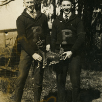 A photograph of two Pacific University students holding the Boxer mascot. The caption with the photograph identifies the students as Glenn 'Red' Sheeley and Leslie 'Jazz' Hoar. The original Boxer mascot was a gift to the school from a missionary named Reverend J. E. Walker. He acquired the Boxer while on a mission trip to China. The Boxer went missing after a Boxer Toss in 1969. This picture appears in an album that was compiled by Greta McIntyre Sheeley, a 1920 Pacific University graduate.