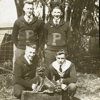 A photograph of four Pacific University freshmen posing around the Boxer mascot. The caption with the photo indicates that these freshmen had captured Boxer. The caption also indicates that Thomas Fowler '21 had taken the tail of Boxer with him when he was called up during World War I. After he had returned to Pacific University, he gave the tail to the freshman class. This picture appears in an album that was compiled by Greta McIntyre Sheeley, a 1920 Pacific University graduate.