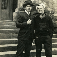 A photograph of two Pacific University students dressed in funny hats. The caption with the photograph identifies the students as Verle Stanley and Thomas Fowler. According to the caption, the pair were in possession of the Boxer mascot and his tail during World War I. Stanley had his head and body, when he was called-up to fight during World War I. He hid Boxer in a flour bin at Mrs. Brown's house on the Pacific University campus. Fowler had Boxer's tail. He took the tail with him when he was called-up. The two pieces were reunited when Stanley and Fowler returned to Pacific University after the war ended in November, 1918. This picture appears in an album that was compiled by Greta McIntyre Sheeley, a 1920 Pacific University graduate.