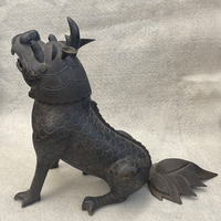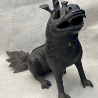 A bronze statue that likely functioned as an incense burner, similar in appearance to Pacific University's qilin "Boxer" mascot. This statue appears to be a 19th or 20th century Chinese (or possibly Japanese?) work depicting an unknown mythological creature, possibly a "Denglong." Its features include: cone-shaped ears; fish-like scales on its back, chest and legs; clawed feet; a mane and tail; protruding black eyes on short stalks; a single horn with two branches on its forehead; a dog-like snout; a fish-like or frog-like mouth; and a dragon-like crest of scales running down its backbone. It is similar to a Qilin, except for the fact that its feet have claws rather than hooves, and it has no whiskers. The statue's head was connected to the body with a hinge (now broken), inside of which incense could be placed, so that the smoke would come out of its nose and mouth. The tail is removable, probably so that ash could be removed. One ear has become loose but still attaches to the body. The statue measures 8.5" high, 4" wide and 10" long.