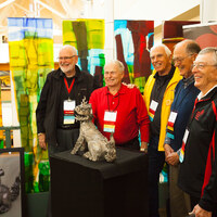 Five Pacific University alumni posing with the "Boxer III" statue at an unveiling event in Tran Library during Homecoming and Reunion weekend, Oct. 19, 2018. From left to right, the alumni pictured are: Bruce Bishop (Class of 1968), Steve Griffels (Class of 1964), Bob Dernedde (Class of 1961), George Kurtz (Class of 1958), and Jerry Frye (Class of 1961). These alumni were among those who conceived and helped fund the creation of Boxer III, which was a replica of the university's original "Boxer" statue. At the time this photograph was taken, the original Boxer had been missing since 1969.