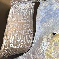 A close-up photograph of a detail from the original "Boxer" statue, taken on February 25, 2024. This image shows what appears to be the partially broken remnants of a whisker or flame attached to the statue's head. Etched names and initials of students who formerly possessed the statue are visible, including: K. Leek (Kenneth Leek, OD 1959); G. Miller; G. Deshler (Eugene Deshler, Class of 1956); R. Tiedgen (William C. Tiedgen, Jr., Class of 1958); H. Butzloff (Hank Butzloff); and D. Anderson (Duke G. Anderson, OD 1959). Most or all of these men were members of the Phi Beta Tau fraternity in the late 1950s; they apparently etched their names on the statue after their fraternity won possession of it around that time.