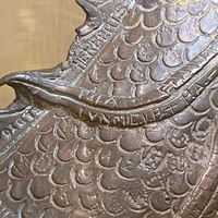 A photograph of the right side of the spine of the original "Boxer" statue, taken on February 25, 2024. This image shows: Boxer's spine, topped with a crest of scales that have been dented through past damage; lines representing magical flames that are commonly associated with Chinese depictions of qilins; and many etched names and initials of students who formerly possessed the statue.