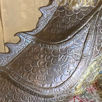 A photograph of the right side of the torso of the original "Boxer" statue, taken on February 25, 2024. This image shows: Boxer's side, covered in scales and lines representing magical flames that are commonly associated with Chinese depictions of qilins; extensive welding scars at the statue's neck and leg joints; and many etched names and initials of students who formerly possessed the statue. Some of the names that are visible include: Lynn Abraham (Class of 1951); Ellis Thompson; Herberts; and RWP.
