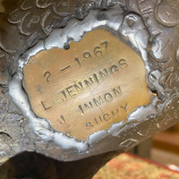 A close-up photograph of a metal patch on the underside of the original "Boxer" statue, taken on Feb. 25, 2024. The patch was welded onto a missing section of the statue after it was damaged. The patch is etched with the note: "2-1967, L. Jennings [Lance Jennings, Class of 1966]; J. Inmon [Jack Inmon, Class of 1969]; and G. Suchy [Gary Suchy, Class of 1969]." All three men were members of the Gamma Sigma fraternity, which is known to have had possession of the statue at about that time.