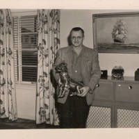 William Skinner standing in a living room holding the Pacific University Boxer. Behind Mr. Skinner is a Crosley cabinet radio and phonograph player. Mr. Skinner was asked to weld one of the legs back onto the body, which he did.