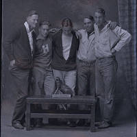 Five male students, unidentified except for Jim Tumbleson (2nd from right), pose in Hillsboro studio with headless Boxer.