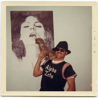 An Alpha Zeta member poses with Boxer on his shoulder.