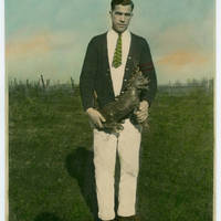 George Tucker, Pacific University Class of 1925, holding "Boxer," a bronze statue that was the symbol of Pacific University. According to a note he wrote on the back of the photograph, this was taken in a field on the outskirts of Forest Grove, Oregon. Another version of this photograph (PUA_MS95_26) includes a note that it was "taken near the bridge where Boxer was hidden by Lenore Conger, a Pacific freshman." The latter quote dates the photograph to 1924-1925. The photograph is hand-colored.