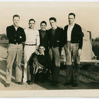 A group of Pacific University fraternity members hold Boxer after they rescued him from would-be snatchers. Left to right are: T. Fishburn, Ed Bennett, Class of 1941, John Uchiyama, Class of 1939, Ed Goddard, Class of 1940, Lewis Merz, Class of 1939, and, in the center, holding Boxer, Myrl Barkhurst, Class of 1939.