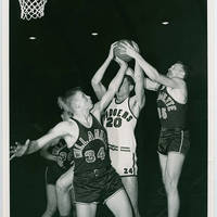 Pacific University Badgers engaged in a basketball game against Willamette. Pacific's mascot was the Badgers until it was changed to the Boxers in 1967.