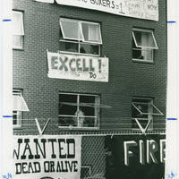 Clark Hall side wall covered in signs supporting the Pacific University Boxers football team.