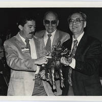 Three men hold Boxer at the Pacific University Class of 1966 twenty-year reunion in May 1986.