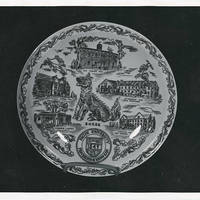 A china plate depicting various buildings on the Pacific University campus, the school's mascot, and the school's crest, founding date, and Latin motto: Pro Christo Et Regno Ejus.