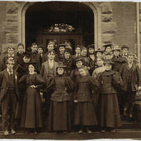 A group photo of the Tualatin Academy class which entered in 1895. They were the first to use Marsh Hall. The students and teacher are identified on the back of the photo. Listed back to front and left to right, they are: Cecil Thomas Humphreys, Frank Erastus Beauchamp, Julius Anton Young, Arthur Elias Yoder, Alfred John Funge, Willis H. Trenner, Fanny Sorensen, Robert Peter Wirtz, Harriet Eva Scholfield, Wilma Waggener, Charlolette Dot Graham, Jennie Lydia Yoder, Samuel Elverton Gates, Ora Della Caples, Margaret Best (Principal of the Woman's Department and Instructor in English), Mabel Hinman, Mary Bailey, William Turpen, Elizabeth Emily Tongue, Eleanor Russell, Ellen Gertrude Garrison, Rowena Pratt, Francis Eolia Cornelius, Jessie Leone Hibbs, James McCalmont Morrison. [Note: All of these students are found within the Pacific University records, however, this appears to be taken during their second year and the students that appear in this photo do not seem to account for the entirety of the 1895 class].