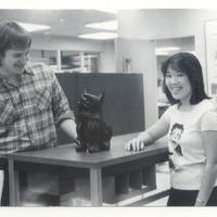 Two Pacific University students pose with a wooden statue that was meant to stand in for the school's original bronze "Boxer" mascot, probably around 1980. The original Boxer statue had been missing for about ten years when this photograph was taken. Students used this wooden statue as a temporary symbolic replacement. This photo was taken near the circulation desk in the Harvey W. Scott Memorial Library, later known as AuCoin Hall. The wooden statue is now in the Pacific University Archives.