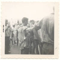 A snapshot photograph of a Pacific University student among a crowd during a "Boxer Toss" in 1960. His ripped clothing is a result of having fought for possession of Boxer, a bronze statue that would later become Pacific's mascot. This photograph appears to have been taken on the edge of Pacific's campus in downtown Forest Grove, possibly on Pacific Avenue.