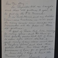 [back] See the Alumn News, Fall of '65 vol 12 no 1, Spring of 66 vol 1 no 1 - with [unintelligible] - to know names and date. [note] Hillsboro, Ore., Nove. 9-1962. Dear Mrs. Story:- Dr. Reynolds told me I might send these old pictures to you, to be put in the P. U. Museum. I - as Ruth Harris, and my brother Allan - were Freshmen in 1914 - and tho many names now escape me - I remember all the faces in these old pictures. A part of Boxer had been missing for many years - and the class in 1914 finally assembled all of him., so soon after school started, a good many of our class went out to Naylor's Grane and had this picture taken. Our class kept possession of him for a good while. Some day I hope to visit the museum again - Sincerely-Ruth Harris Euschede (Mrs. W. J.) 801 S. 7th Ave., Hillsboro Oregon.