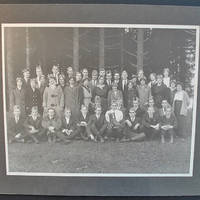 A group of Pacific University students, members of the class of 1918, pose for a picture after reassembling the Boxer statue in 1914, their freshman year. They are wearing the Pacific University beanies students received as freshmen. The students are identified in Pacific Today, Volume 1, Issue 1, Spring 1966. They are as follows: First row - Thomas Reuben Roe, unidentified, unidentified, Watt Andrew Long, Wilford Myron Briggs, Byron Matthew Goodman, John Converse 'Vercy' Bellinger, Thayne Miller Livesay, Laben Earle Morin, and Darrell Vincent Heisler [original author unsure of identity]. Second row - Leo Sheridan Lucas, Glenn Robert Jack, Samuel Verle Stanley, George Wilcox, and John Ireland. Third row - Grace Almeda Zerba, Ruth Carson Stewart, Emma Craft, Emma Harris [more likely Ruth Harris], Rhoda Christina Enschede, Elizabeth Simon, Hazel Evelyn Gilpin, Nettie Viola Davis, unidentified, Mary Margaret Bean [original author unsure of identity, note: she was a senior at Tualatin Academy in 1914], unidentified, Myrtle Lola Gilpin, Charlotte Victoria Morrison, Janeese [Janness, original author unsure of identity] Lola Miller [original author unsure], Alta Josephine Soule, unidentified, unidentified, and Fred Margaret Acker, Fourth row - Lester Tallmon Jones, Charles Shannon Hancock, Elbert John Taylor, Martin John Bernards [note: he was a senior at Tualatin Academy in 1914], unidentified, Harold Arthur Reed, unidentified, Irvin William Turner, unidentified, Newton Conger McCoy, Lawrence Fulton Clark, and Carl Colvin Curtis.