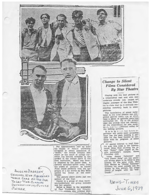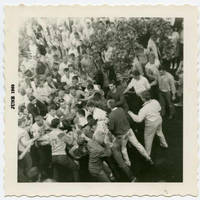 At exactly 12:20 p.m., a Jeep roared across campus to the walk in front of Warner Hall and screeched to a stop as Bob Wendel, ex-co-owner of Boxer tossed out the little bronze dog which landed on the grass, flipped over and came to a momentary rest before a crowd surged forward and pounced on him. The three hour and thirty-five minute battle which ensued was confined primarily to his same area south of Warner Hall although it did move completely off campus after two hours had elapsed. [...] Suspense heightened as the pulsating mass moved around the west end of Warner across the pavement to a filling station, then poured into the street in front of the fire department. The multitude immediately scattered as Don Printz, clutching one of Boxer's front legs, and Doug Steward, both Phi Betes, raced down the highway in front of the fire department, across the railroad tracks and safely reached a get-away car. Those who had the rest of Boxer surged across the highway into the parking lot followed by an ever-increasing crowd which inched its way along the parking lot, out into the street, into the parking lot again and finally on to the tracks. [...] Finally, Tod Johnson, AZ, managed to free himself from the clutching crowd and ran with Boxer through the alley by the police station. He threw the bronze idol to Paul Thompson [...]. Shortly before he reached the car, Thompson threw the dog to independent Ron Eastwood who was running along beside him with instructions to put it in La Rue's car. [... The account continues, noting that Boxer's other leg and one ear were also broken off in the fight.]Of the thirteen students who came to the infirmary for first aid only two had to have stitches. Two received treatment for broken hands and two were released after being examined by a doctor for possible brain concussions. One student suffered a dislocated nose, another received a sprained ankle and one co-ed rebroke her little finger.