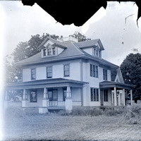 A large, two-and-a-half story house in the countryside near Forest Grove, Oregon circa 1910-1914. The house appears to have been relatively new when the photograph was taken. It displays some Craftsman-style elements including wide porches, tapered wood columns and dormers. It is standing in front of an older, smaller house. The yard has been mown recently, with loose stacks of hay on the ground. Several outbuildings and trees appear in the background. The photograph suffers from damage to the emulsion layer on the negative, with part of the image cracked off; the left side is also overexposed. For another less damaged view of the same house, see image PUA_MS154_015.