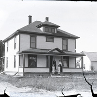 A family stands on the porch of a large house in the vicinity of Forest Grove, Oregon circa 1910-1914, possibly near Banks or Hillside. The family appears to include a mother, father, their two daughters and a son, all dressed up in nice clothes. The girls wear matching dresses and large bows on their heads, while the boy wears a sailor-style outfit. The house appears to have been recently constructed at the time this photograph was taken. It is two-and-a-half stories tall with two chimneys and some elements of Craftsman style, including a large porch, one dormer, stained glass over the front windows, tapered columns, and a front door with a window and sill. Wood plank sidewalks lead around the house. Several sheds or outbuildings appear in the background.