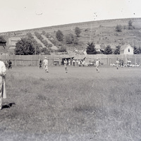 A baseball game in the vicinity of Forest Grove, Oregon circa 1910-1914. The teams appear to be changing sides, with people walking to and from the infield. A covered stand in the background seats women spectators. Men and boys sit on the sidelines watching the game. A makeshift dugout for one of the teams is along the fence. On the hill behind the baseball field, there is a small orchard (center-left), a logged field (right), a hops field (top of hill along the ridge), and several small houses (lower right). Based on other images by Clapshaw, this likely depicts the team from Hillside, Oregon. There is another photograph that depicts the same field and possibly the same game; see image PUA_MS154_019.