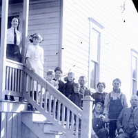 A group portrait of children and adults on a porch in the vicinity of Forest Grove, Oregon circa 1910-1914, possibly in the Hillside neighborhood northwest of town. Based on the range of ages of those present, this may be a portrait of an extended family. Most are formally dressed in what were likely some of their best clothes. These are likely relatives and/or friends of the photographer, William Alonso Clapshaw.