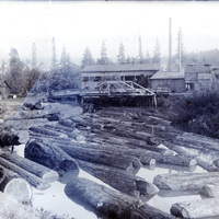 A pond filled with floating logs waiting to be cut for lumber at the sawmill in the background. A small bridge, a shed, and workers standing inside the mill are also visible. This photograph was taken in the vicinity of Forest Grove, Oregon circa 1910-1914. It may show the mill that was formerly located near the intersection of String Town Road and Highway 8 between Forest Grove and Gales Creek; the ridgeline in the background appears to match the one seen from that location. At this time, logging companies would cut trees in the Tillamook Forest and then float them down Gales Creek for milling.