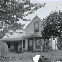 An house with a side gable near Forest Grove, Oregon circa 1910-1914; possibly located around Hillside, Gales Creek or Banks. The house appears to be already several decades old in this photograph, perhaps dating from the 1870s-80s. A dog, possibly a collie mix, sits on the grass in the foreground near several fruit trees. Flaws in the image are due to deterioration of the emulsion layer on the negative.