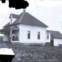 A farmhouse in the countryside near Forest Grove, Oregon, circa 1910-1914; possibly around Hillside or the town of Banks. An older couple are on the porch, with the man sitting in a rocking chair and holding a cat. The house is relatively small with a pyramidal hip roof, a single dormer window, a small addition (probably a kitchen) on the back, and several sheds or outbuildings in the rear. A low-lying, leafy vegetable crop (possibly rhubarb?) is growing directly next to their house. Flaws in the image are due to deterioration of the emulsion layer on the negative.