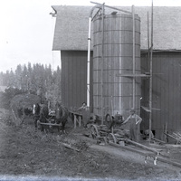 Men on a farm near Forest Grove, Oregon, fill a silo attached to a barn. The man in the bowler hat (right) is tending an engine that is driving a belt. The belt turns a wheel which is attached to a silo-filling machine (center, with tall white pipe extending vertically). The man by the silo-filling machine is feeding hay into its hopper, which the machine chops and then blows through the pipe into the silo. A third man, standing on the wagon drawn by two horses, is delivering the hay -- possibly alfalfa. This was likely to be used as livestock feed. A farm dog stands on the right, and one more man stands almost behind the silo, facing away from the camera. A pulley system is attached to the side of the barn. This photograph was probably taken in the Hillside, Gales Creek or Banks neighborhoods between 1910-1914.