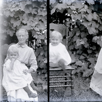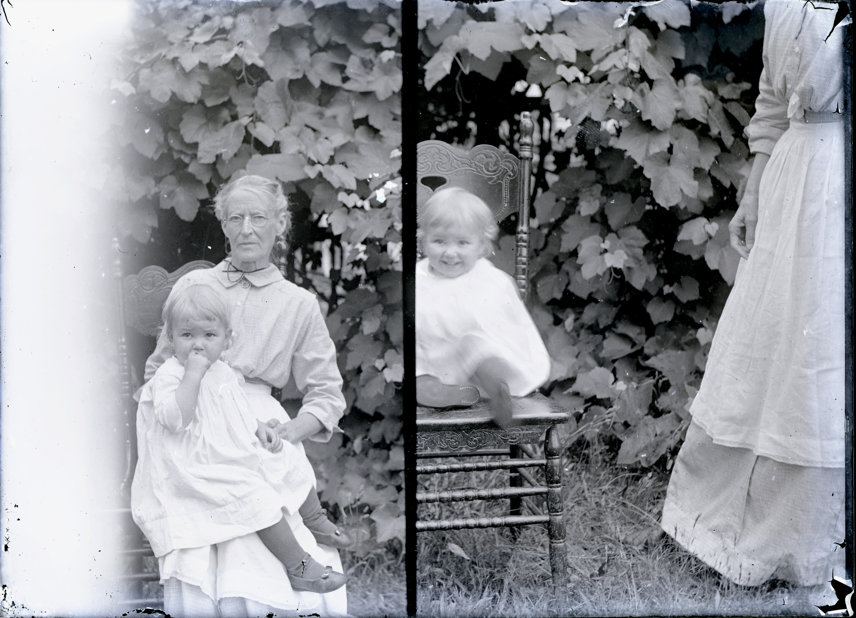 Two photographs of a young, blond girl probably aged between 1-2 years old, and an older woman who might be her grandmother. In the image on the left, the girl sits on the grandmother's lap. On the right, the girls sits on the chair alone, while the grandmother is partially out of the frame. They are outdoors, with a hedge behind them. This photograph was probably taken near Forest Grove, Oregon circa 1910-1914. The photographer, William Alonso Clapshaw, made the two images by exposing first one half and then the other of a glass plate negative.
