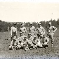 A baseball team near Forest Grove, Oregon circa 1910-1914; probably in the Hillside neighborhood. The field appears to be located near the intersection of Hillside and Clapshaw Hill Roads, looking west towards the hills. The men are wearing uniforms with the logo "HT". Baseballs, bats, mitts, and a catcher's mask are visible in the image. A barn and fencing stand in the background.
