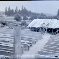 Stacks of bricks drying at a brickyard in Wilkesboro near the town of Banks, Oregon circa 1910-1914. In this image, two men are working in a shed that holds brick-making machinery, which is powered by a belt that the steam engine tractor (left, background) drove. The wooden tower structure (center) may be a water pump. The photographer, William Alonso Clapshaw, exposed half of a glass plate negative to create this image. The other half of the glass plate was used to make another photograph of the same brickyard; see image PUA_MS154_036a.