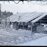 A brickyard in Wilkesboro near the town of Banks, Oregon circa 1910-1914. In this image, two men stand next to a small rail car that resembles a mining cart, which is set on narrow gauge rails. The car is filled with a clay mixture; this was raw material for the bricks. Two other workers stand to the left. The shed behind them holds the brick-making machinery, which was powered by a belt that the steam engine tractor (left, background) drove. The wooden tower structure (left, midground) may be a water pump. Stacks of bricks are drying in the foreground. The photographer, William Alonso Clapshaw, exposed half of a glass plate negative to create this image. The other half of the glass plate was used to make another photograph of the same brickyard; see image PUA_MS154_036b.