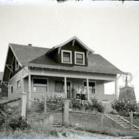 Three women stand on the porch of a well-kept house in the countryside in the vicinity of Forest Grove, Oregon circa 1910-1914; possibly near Hillside, Banks or Gales Creek. The two younger women who appear to be in their teens are dressed identically in loose shirts with wide collars; they may be sisters. The older woman may be their grandmother. The house is of fine quality for a farmhouse of this period, with several elements of Craftsman style including the porch, dormers on the second floor, exposed rafters, tapered pillars, and a front door with a window and exterior sill. A line of rose bushes stands in front of the house, along with cement stairs and a gated fence. A windmill, possibly sitting on top of a small water tower, is in the background. An outbuilding is behind the house on the left.