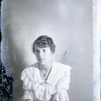 A young woman poses for a portrait. She is wearing a white blouse with lace trim, a white skirt, a brooch and a necklace with a locket. Her hands rest on a table. This photograph was taken by amateur photographer William Alonso Clapshaw, probably in a home studio circa 1910-1914. Several other photographs exist that were taken in the same setting. The woman may have been a friend or relative of the photographer. For another version of this portrait, see Image PUA_MS154_042. Flaws in the image are due to deterioration of the emulsion layer on the negative.