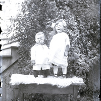 Two children stand on a sheepskin that has been laid on top of a small table. Both are dressed in fine clothes, with the girl aged around 3 wearing a lacy dress, a bow in her hair and fancy shoes, and the boy wearing a sailor-style outfit. The table sits outdoors on the grass by some stairs, with a dense vine or bush behind them. Flaws in the photograph are due to deterioration of the emulsion layer on the negative.