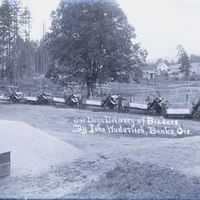 Several men and boys stand with a set of Adriance brand reaper-binders in Banks, Oregon, circa 1910-1914. A caption reads: "One Day's Delivery of Binders By John Wunderlich, Banks, Ore." John Wunderlich was a merchant in Banks at the time. Many houses are in the background of this image; a woman stands of one their porches. The reaper-binder machines were used to cut grain and bind it into bundles or sheaves, which would then be pushed into cone-shaped stacks that would be left to dry in the fields. This photograph may have been taken at or near the train depot in Banks. For another version of the same scene, see image: PUA_MS154_055