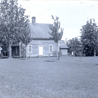 A small house with clapboard siding in the countryside near Forest Grove, Oregon. The house has a wood shingle roof and a central chimney, surrounded by a large grass lawn. A girl and a dog stand in the background. Trees and bushes are planted around the yard. It was taken circa 1910-1914 by William Alonso Clapshaw.