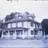 A large, two-and-a-half story house in the countryside near Forest Grove, Oregon circa 1910-1914. It appears to have been relatively new when the photograph was taken. It displays some Craftsman-style elements including wide porches, tapered wood columns and dormers. It is standing in front of an older, smaller house. The yard by the house has been mown recently, with loose stacks of hay on the ground. Several outbuildings and trees appear in the background. Flaws in the photograph are due to dust and deterioration of the emulsion layer on the negative. For another, albeit damaged, view of the same house, see image PUA_MS154_058.