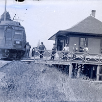 People standing on the platform of the Wilkesboro train station near Banks, Oregon, circa 1911-1914. This was a stop on the electric interurban United Railways route that ran from Portland to Wilkesboro beginning in 1911. Train car number 900 is on the track. For another photograph of this station and more information about the railway line, see: Hallgren & Due, "United Railways of Oregon" (1961).