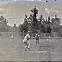 A baseball player rounds the bases at a baseball game near Forest Grove, Oregon circa 1910-1914; possibly in Banks or Gales Creek. A player appears to be heading towards second or third base while the baseman prepares to catch the ball. The photographer, William Alonso Clapshaw, exposed half of a glass plate negative to create this image. The other half of the glass plate was used to make another photograph of the same game; see image PUA_MS154_008a. Based on other images by Clapshaw, the runner in this image likely belonged to a team with initials "HT" (or "TH" if the image is reversed). Flaws in the photograph are due to dust and deterioration of the emulsion layer on the negative.