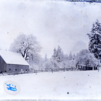 A wintry scene showing a barn, fences and a lean-to in a snow-covered field, with trees in the distance. The edge of a house (possibly the same house that appears in image PUA_MS154_002) appears in the background, mostly obscured by trees. This property may be associated with the Clapshaw Family who lived in the Hillside neighborhood northwest of Forest Grove, Oregon. The photograph was taken by William Alonso Clapshaw, probably circa 1910-1914. Flaws in the photograph are due to dust and deterioration of the emulsion layer on the negative.