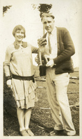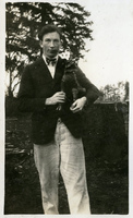 A photograph of Charles McGill holding Pacific University's Boxer mascot. Charles McGill was in the Pacific University class of 1930; he attended on a scholarship as a freshman, and then transferred to the University of Washington. He later became a doctor and married another Pacific University alum, Edith Hansen. The original Boxer mascot was a gift to the school from a missionary named Reverend J. E. Walker, who acquired Boxer while on a mission trip to China. This photograph appears in an album that was compiled by Edith Hansen McGill, a 1930 Pacific University graduate.